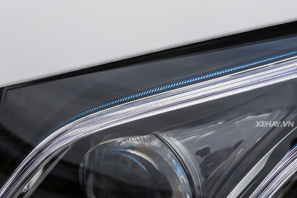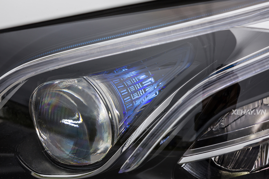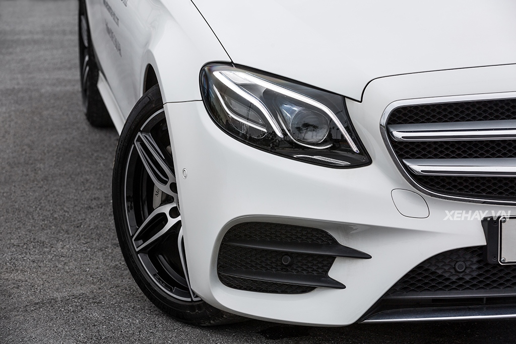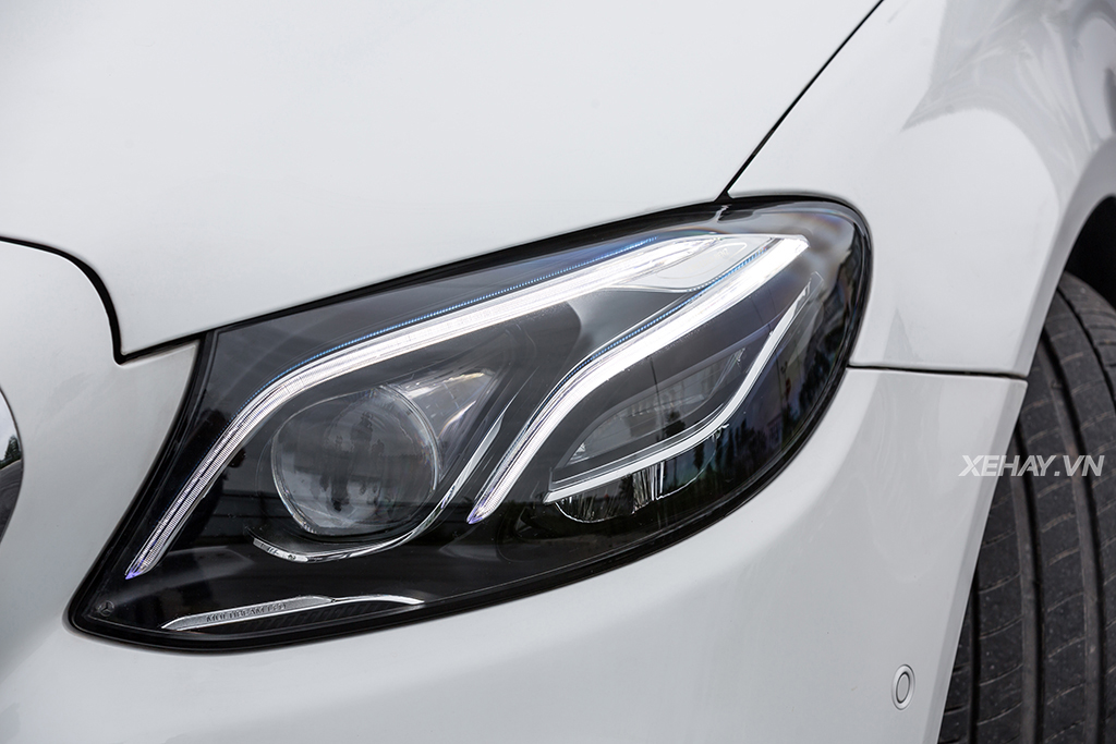 Nhìn từ phía trước, chiếc E300 AMG có ánh nhìn vô cùng thu hút được tạo ra bởi hai cụm đèn pha LED vô cùng đẹp mắt. Cụm đèn Multi-beam LED này là sự khác biệt dễ nhận thấy nhất giữa E300 bản lắp ráp trong nước và E300 nhập (chỉ có đèn LED thông thường). Cụm đèn Multi-beam có tới 84 đi-ốt LED cường độ cao cho khả năng chiếu sáng từng vùng nhằm tránh làm lóa mắt người đi đối diện. Bên cạnh các đèn pha LED thông minh, xe còn có bốn dải đèn Led định vị chạy dọc xuống mũi xe nhìn rất độc đáo. Dù E300 AMG bản lắp ráp rẻ hơn bản nhập xấp xỉ 300 triệu nhưng trang bị đèn chiếu sáng thông minh này là một điểm cộng lớn.