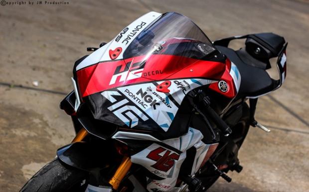 Thùng xăng R1 có dung tích 17 lít. Chủ xe dán thêm miếng lót giả vân carbon giúp người lái thoải mái hơn, khi ép bụng vào bình xăng.