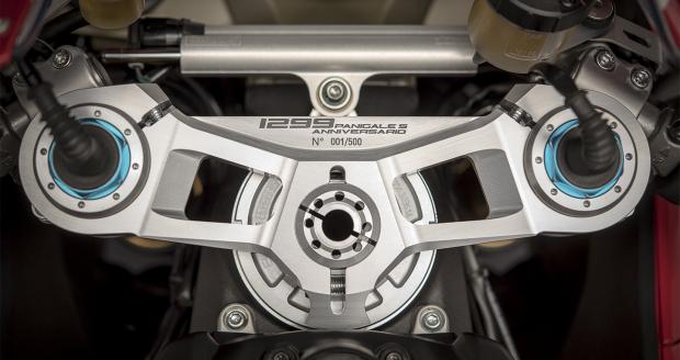 Ngoài ra, ở phiên bản này còn được tích hợp hệ thống treo bán chủ động thông minh (Smart EC) kết hợp với phuộc Ohlins và bộ đo quán tính độc lập của Bosch (IMU) giúp động cơ hoạt động ổn định hơn. Đặc biệt, trên mỗi chiếc Ducati 1299 Panigale S Anniversario đều được khắc số thứ tự trên tay lái xe.
