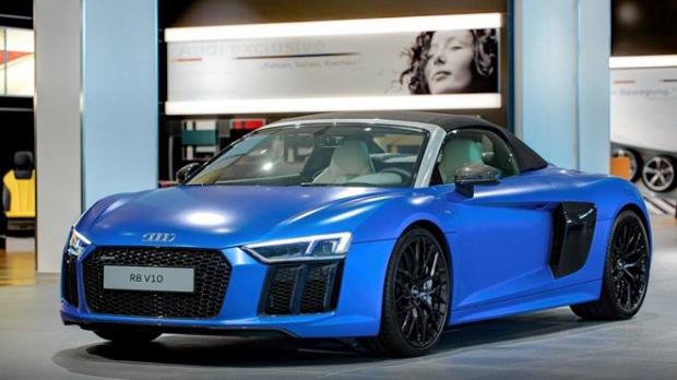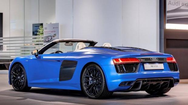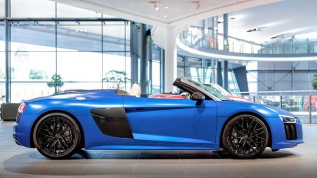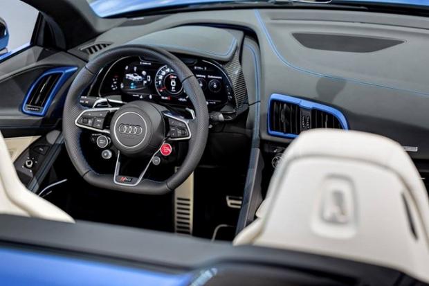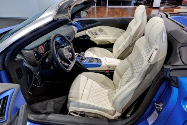Màu xanh dương Abablau thường được bắt gặp trên mẫu SQ5, tuy nhiên khi được đưa lên mẫu mui trần R8 V10 Spyder, siêu xe này trở nên độc đáo và bắt mắt hơn.