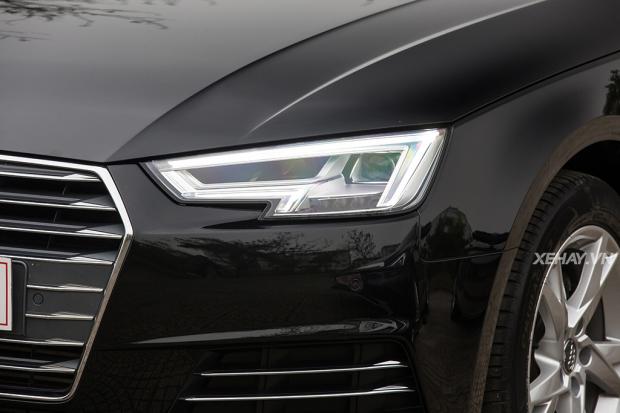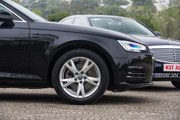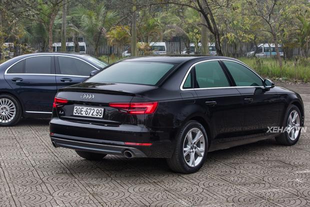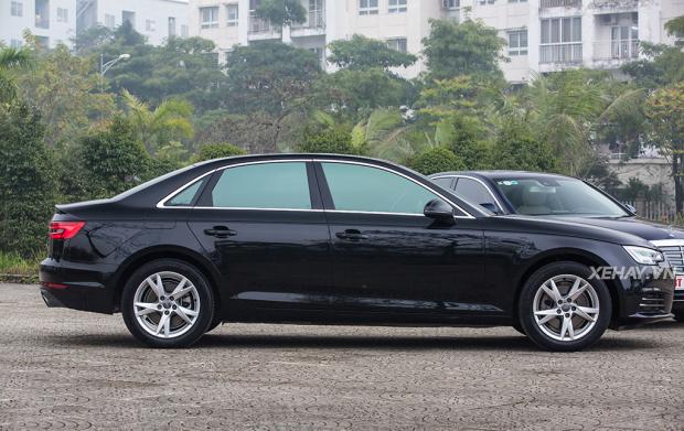 Trên thực tế thì Audi A4 cũng là mẫu xe dài nhất phân khúc với chiều dài tổng thể 4.726 mm, hơn 21 mm so với thế hệ cũ, hơn BMW 3 Series 102 mm (!) và hơn Mercedes C-Class 40 mm. Độ dốc của phần kính lái và kính chắn gió sau gần như tương đồng, tạo nên sự cân xứng đậm chất hình học cho Audi A4. Điểm nhấn cuối cùng ở bên thân xe là bộ la-zăng 17 inch có thiết kế 5 chấu kép rất thể thao.