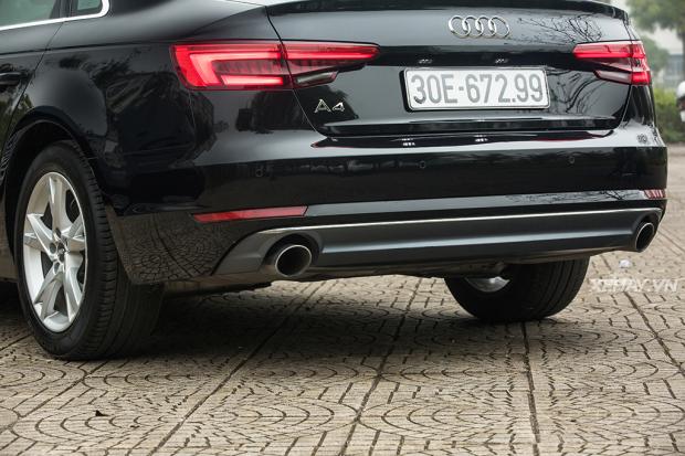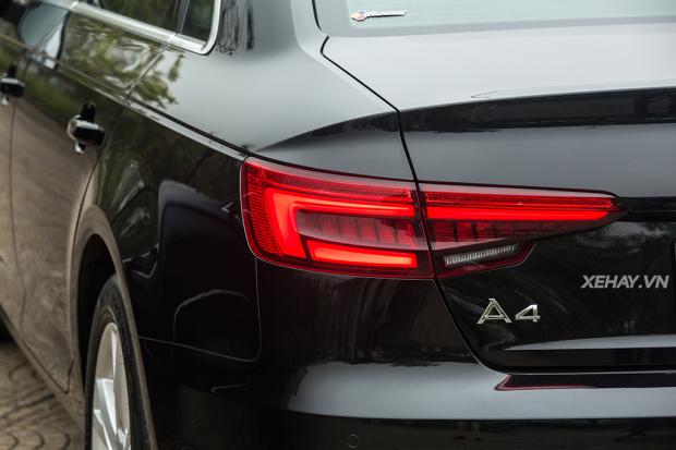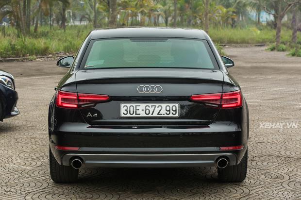 Xét đến phần đuôi xe, Audi A4 tiếp tục gây ấn tượng với những đường gờ, đường phẳng đối xứng rất đẹp mắt. Cánh gió sau lớn hơn, nổi bật hơn so với Mercedes C250, cụm đèn hậu có thiết kế sắc bén tương tự đèn pha phía trước và dải đèn báo rẽ có hiệu ứng chạy từ trong ra ngoài rất ấn tượng. Cặp ống xả kép với thiết kế tròn cũng khẳng định cá tính trẻ trung và thể thao của Audi A4.