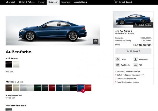 Về phần A5, trang bị tiêu chuẩn của xe bao gồm đèn projector Xenon trông khá hiền với giá 44.850 euro (~ 1 tỷ 103 triệu VNĐ). Có ba mẫu xe tiêu chuẩn để lựa chọn: A5, A5 Sport, và A5 Design. Nhưng cả ba đều trông khá giống nhau, khác với các đối thủ của BMW 4 Series.