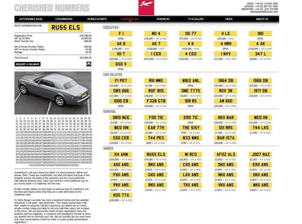 Tuy nhiên WED 11N có giá 8.333 bảng (~243 triệu VNĐ). Những biển số đáng chú ý khác được bán bởi Kahn có thể kể ra như 1 CEO (375.000 bảng, ~10 tỷ 940 triệu VNĐ), 00 77 (25.000 bảng ~729 triệu VNĐ), 4 K (450.000 bảng, ~ 13 tỷ 128 triệu VNĐ), 180 (£POA, cho giá theo yêu cầu), AK6 hoặc AK7 (150.000 bảng, ~ 4 tỷ 376 triệu VNĐ), WB12 AML (£POA, cho giá theo yêu cầu), 1964 DB (35.000 bảng, ~ 1 tỷ 21 triệu VNĐ), ROV 3R (25.000 bảng, ~ 729 triệu VNĐ), 918 RS (£POA, cho giá theo yêu cầu), F328 GTB (20.000 bảng, ~583 triệu VNĐ), ERO 71C (£POA, cho giá theo yêu cầu), HE11 WAR (20.000, ~583 triệu VNĐ ), EAR 77H (2.999 bảng, ~87 triệu VNĐ), and K4 AHN (250.000 bảng, ~ 7 tỷ 293 triệu VNĐ).
