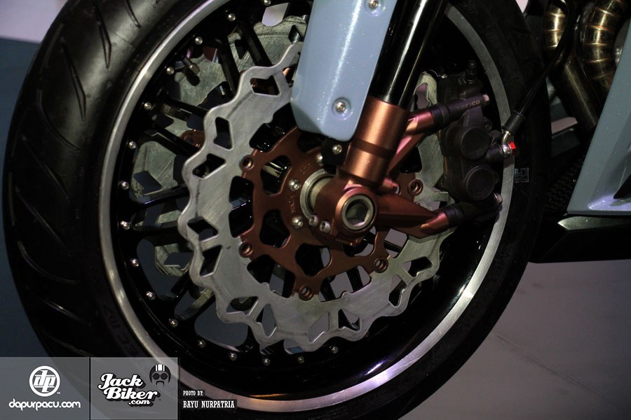 Honda CBR250RR phiên bản độ chính hãng được sơn màu xanh nhạt độc đáo. Đối lập với màu sơn này là hàng loạt chi tiết màu đồng và trắng.