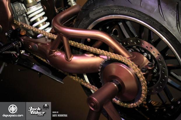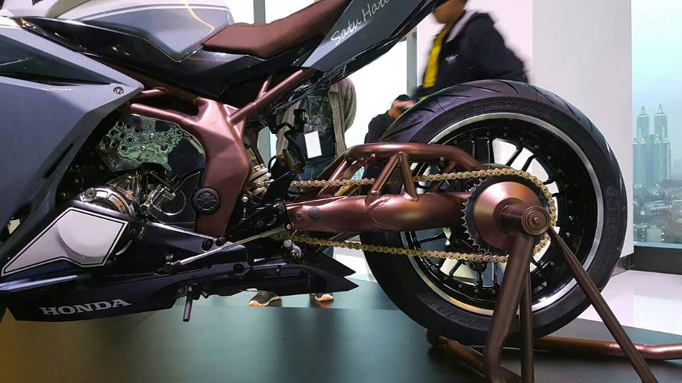 Tuy nhiên, điểm nhấn của chiếc Honda CBR250RR phiên bản độ chính hãng lại nằm ở gắp sau. Ngoài màu sơn đồng như bộ khung, gắp sau của Honda CBR250RR phiên bản độ chính hãng còn là loại đơn, dạng ống và nằm bên trái.