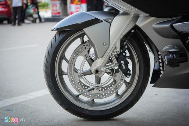 Bánh trước trang bị phanh đĩa đôi, đường kính 320 mm, tích hợp hệ thống chống bó cứng phanh ABS Pro. Bánh xe kích thước 120/70-17. Ngoài ra, BMW K 1600 GTL Exclusive còn trang bị hai đèn sương mù LED ở hai bên yếm xe.