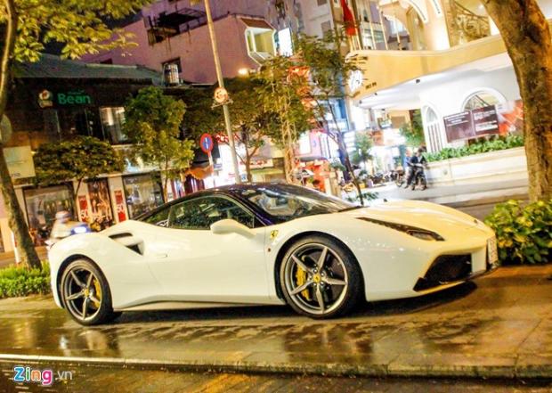 Ferrari 488 GTB màu trắng đầu tiên tại Việt Nam mới đây cũng xuất hiện trên đường phố cùng thiếu gia này. Siêu xe được đưa về nước hồi cuối tháng 2 năm nay cùng với một chiếc màu đỏ và một chiếc màu xám. Theo giới kinh doanh xe nhập, Ferrari 488 GTB có giá khoảng 650.000 USD tại Việt Nam (14,5 tỷ đồng).