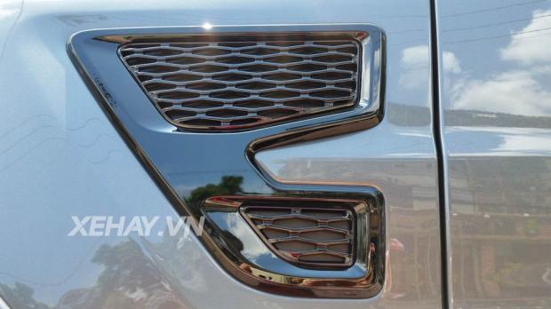 Ngoại thất của chiếc Range Rover Sport SVR có màu xám được hoàn thiện với cản trước mới và hốc hút gió cỡ lớn, tấm chắn bùn đặc biệt, ốp hông tạo vẻ cơ bắp.