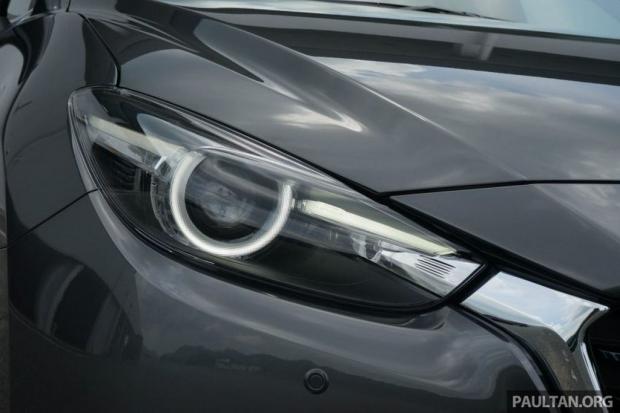 Về mặt an toàn, Mazda 3 facelift là mẫu xe đầu tiên kết hợp hệ thống nhận diện tín hiệu giao thông Traffic Sign Recognition System. Hệ thống này sẽ nhận biết giới hạn tốc độ, các tin hiệu cấm đi và dừng lại. Ngoài ra cụm đèn pha LED thích ứng dũng được chia thành bốn đèn đi ốt ở mỗi bên, có thể tắt độc lập các đèn khi gặp xe khác phía trước để tránh vị chói mắt những lái xe khác.
