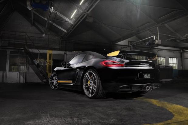Đó là Cayman GT4 – 'lăn bánh' khỏi nhà máy với bộ bánh xe 20 inch. Tuy nhiên chiếc xe trong những bức ảnh này được trang bị phiên bản 21 inch của TechArt Formula IV, với miếng đệm 5 mm ở phía sau giúp chiếc xe mang 'dáng đứng' mạnh mẽ hơn.
