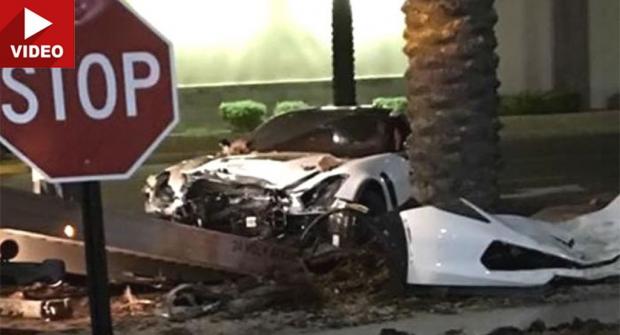 Chiếc xe lật nghiêng trên dải phân cách, có vẻ như lái xe đã điều chỉnh quá tay độ rung xe và lái chiếc Z06 vào làn đường và đâm phải một hàng cây cạnh đó.
