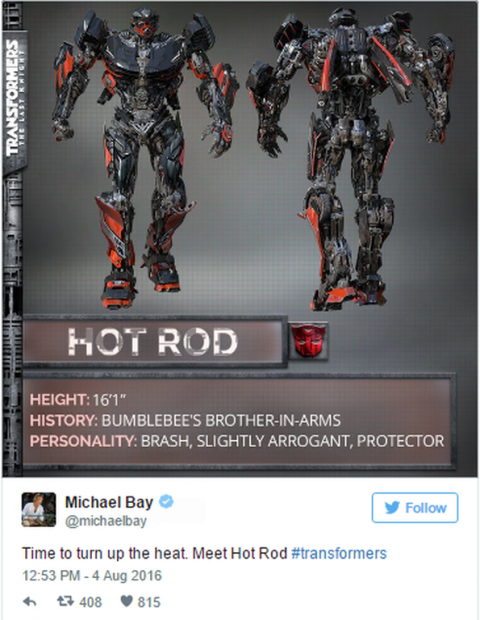 Sau khi tiết lộ các nhân vật Bumblebee và Barricade và giới thiệu Drift cũng như Onslaught, đạo diễn Bay vừa mới vén màn Hot Rod, một nhân vật anh hùng kinh điển trong Transformers sẽ ra mắt màn ảnh rộng.