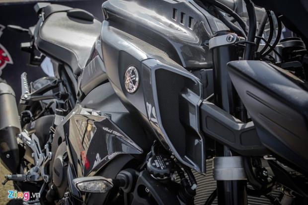 Hai bên sườn xe trang bị hốc gió lớn. Dàn vỏ không rườm rà, điểm xuyết bằng một số đường cắt xẻ kết hợp cùng màu sơn đen làm tăng thêm vẻ mạnh mẽ của chiếc xe. Những đường nét gân guốc trên bình xăng khiến MT-10 trở nên nam tính.