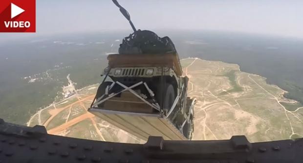 Chỉ vài giây sau khi chiếc xe quân sự Humvee rời khỏi bụng máy bay Boeing, dù lập tức được bung ra trước khi chiếc Humvee tiếp theo thực hiện màn “nhảy dù”.