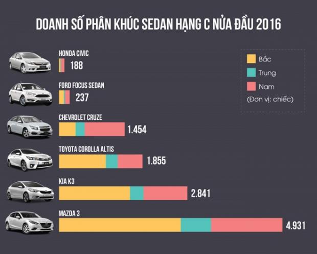Mazda 3 và Kia K3 hiện cũng là 2 dòng xe bán tốt nhất trong phân khúc sedan hạng C. Những đối thủ còn lại có doanh số tương đối thấp. Thống kê từ số liệu bán hàng của VAMA cho thấy, 6 tháng đầu 2016, Honda Civic chỉ đạt 188 xe bán ra, Ford Focus sedan là 237 xe, Chevrolet Cruze là 1.454 chiếc và Toyota Corolla Altis đạt 1.855 xe.