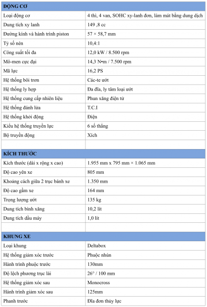 Trái tim của TFX150 là khối động cơ phun xăng điện tử 150cc, 4 thì, 4 van, xy-lanh đơn, làm mát bằng dung dịch. Tỉ số nén động cơ 10,4:1 và buồng đốt nhỏ gọn, công suất tối đa có thể lên tới 12.0 kW tại 8.500 vòng/phút và mô-men xoắn cực đại là 14,3 N•m tại 7.500 vòng/phút.