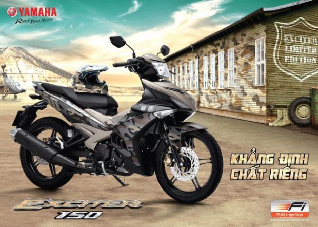 Trong khi đó, trên trang web chính thức của Yamaha Việt Nam lại lặng lẽ xuất hiện thông tin về Exciter 150 Camo và Movistar mới. Ở phiên bản mới, Yamaha Exciter 150 Camo được thay đổi màu sơn từ đen-xanh lục sang đen-vàng cát-xám.