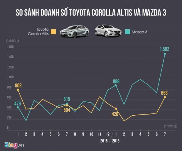 Trong 3 tháng 6, 7, 8/2015, Mazda3 và Altis có doanh số tương đương nhau. Bắt đầu từ tháng 9/2015, Mazda3 bỏ xa Altis, doanh số gấp từ 2 đến 3 lần. Đặc biệt, tháng 4/2016, lần đầu tiên Mazda3 chạm ngưỡng trên 1000 xe/tháng, trong khi đó Altis chỉ bán được 306 chiếc.