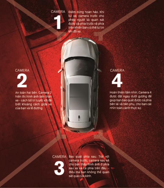 Chuỗi tín hiệu hình ảnh từ 4 camera sẽ được xử lý và truyền tải đến màn hình màu hiển thị đa thông tin 6,5 inch với độ phân giải cao được chia làm hai khung hình: Khung hình bên trái thể hiện hình ảnh trực tiếp thu được từ các camera. Khung hình bên phải mô tả toàn bộ quang cảnh quá trình di chuyển của xe từ trên cao – tổng hợp từ chuỗi các hình ảnh (trước – sau – trái – phải) .