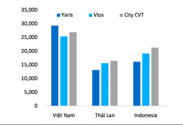 Giá ôtô ở Việt Nam so với Thái Lan, Indonesia cùng chủng loại. Đơn vị: USD. Nguồn: DNSE