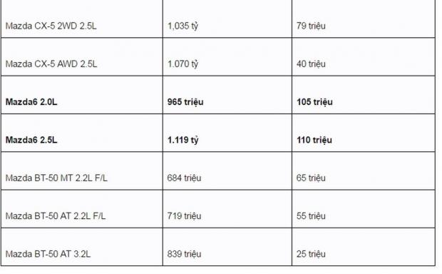 Mức giá ưu đãi cao nhất thuộc về Mazda6 khi giảm tới 110 triệu đồng kế tiếp là Mazda BT-50 ưu đãi 65 triệu đồng, Mazda3 2.0L sedan ưu đãi 60 triệu đồng và Mazda CX-5 có mức ưu đãi 79 triệu đồng.