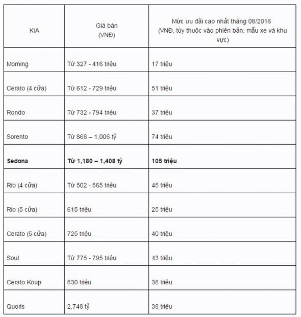 Đối với Kia thì Kia Sedona được ưu đãi 'khủng' nhất khi giảm tới 105 triệu đồng, kế đến là Sorento 74 triệu đồng và Kia Cerato là 51 triệu đồng.