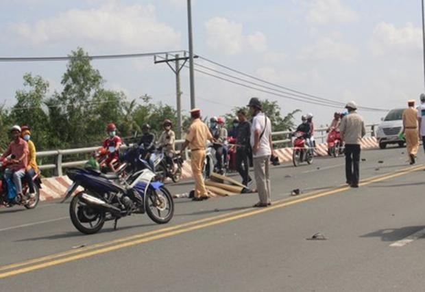Khi xe cứu thương trên vừa lên dốc cầu khoảng 200m tông vào xe mô tô mang BKS 70U1-1113 do anh Trần Văn Phong Em (SN 1986, ngụ tỉnh Long An) điều khiển.