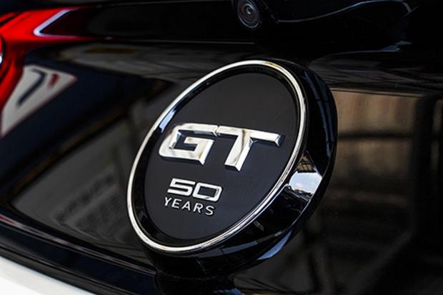 Khác với các mẫu giới hạn trước đã được bán ra, Ford Mustang GT 5.0 Limited Edition có thêm khung kim loại bao quanh logo “ngựa hoang”, logo bản kỉ niệm 50 năm thay thế chữ GT ở phía sau.