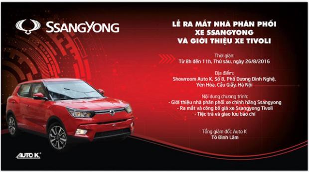 Mới đây, một nhà phân phối hoàn toàn mới của Ssangyong là Auto K đã chính thức gửi giấy mời báo chí tới dự lễ ra mắt và công bố giá xe Tivoli 2016 vào ngày 26/8. Theo thông tin mà phóng viên có được từ ông Tô Đình Lâm – Tổng giám đốc Auto K, giá bán Ssangyong Tivoli sẽ “gây sốc” bởi đối thủ chính sẽ so với Ford EcoSport phiên bản 1.5L AT Trend (giá 630 triệu đồng sau 1/7 2016). Mặc dù không tiết lộ giá bán nhưng ông Lâm cho biết giá xe cực kỳ cạnh tranh ngay cả với Tivoli số tự động do nhà cung cấp khác bán ra trước đây.