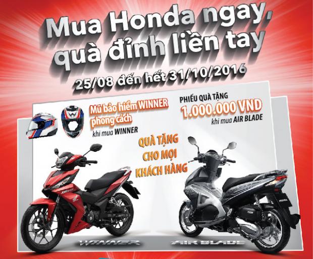 Riêng hai mẫu xe là Air Blade 125 và Winner 150 có quà tặng riêng. Khách mua xe tại các HEAD sẽ nhận được lần lượt là 01 phiếu quà tặng có trị giá 1 triệu đồng (cho xe Air Blade 125) và 1 mũ bảo hiểm Winner sành điệu (cho xe Winner 150). Phiếu Quà Tặng áp dụng ngay tại lần mua xe đó, không được cộng dồn, không quy đổi thành tiền mặt hay những mục đích sử dụng khác (dùng mua Phụ tùng hoặc làm dịch vụ tại HEAD...).