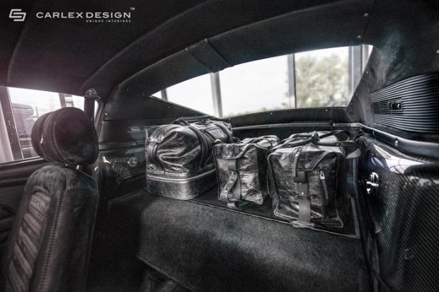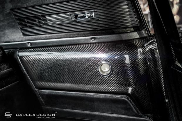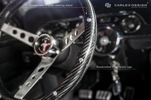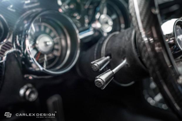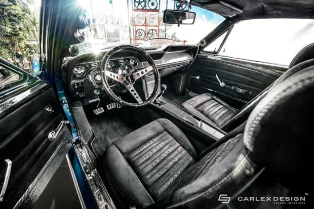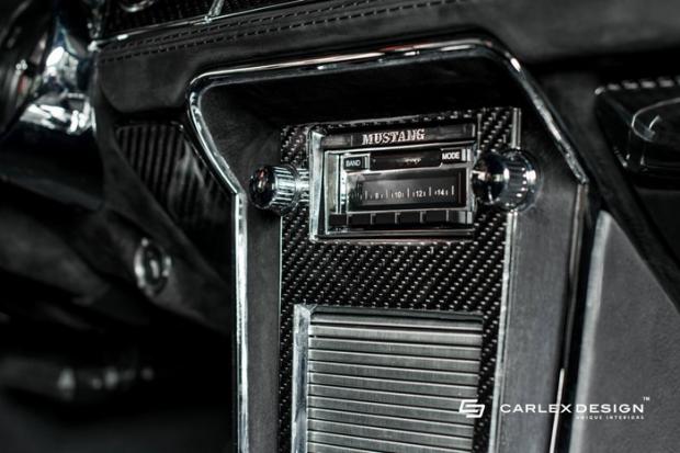 Bên trong ca-bin là nội thất hoàn toàn mới và sử dụng nhiều vật liệu xa xỉ như sợi carbon và bọc Alcantara. Carlex đã thiết kế lại nhiều chi tiết bên trong xe, ốp sợi carbon lên táp-lô trung tâm, kèm với đồng hồ kim cơ tối giản của Ford Mustang. Vật liệu đắt tiền vốn thấy nhiều trên các siêu xe thể thao hiện đại được Carlex sử dụng nhiều trên chiếc xe đời cổ, từ các nẹp ốp ở hàng ghế trước, ốp viền cánh cửa, bao quanh cột mui tới bọc viền vô lăng được tán chốt bạc. Da Alcantara đắt tiền cũng là cảm hứng vật liệu chính trên xe. Ghế thể thao múi ngang mang phong cách cổ điển bọc Alcantara thủ công thiết kế cổ điển. Sở trường của Carlex là kĩ năng làm da được phô diễn trên cả lót trần nội thất, cột vô-lăng và nhiều chi tiết tay nắm bên trong cabin.