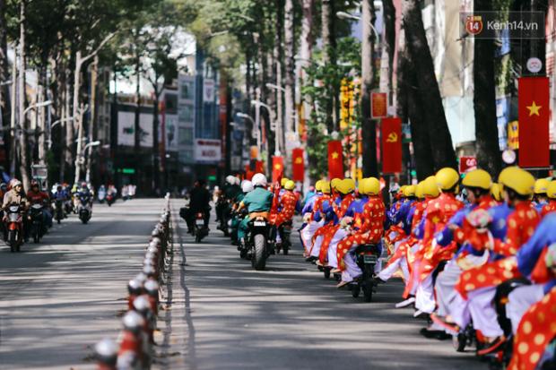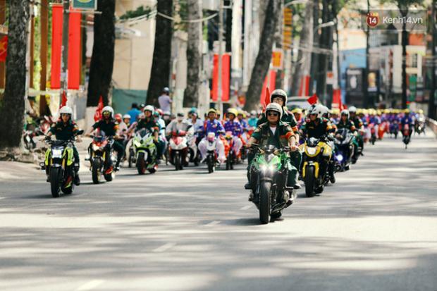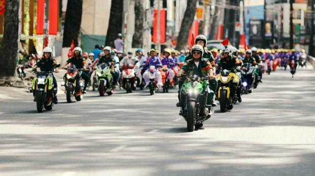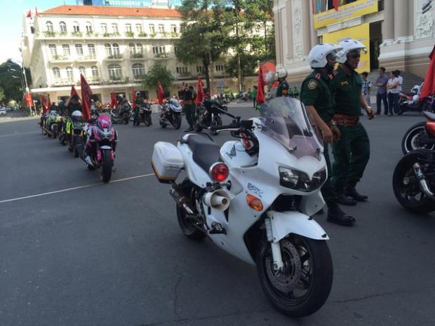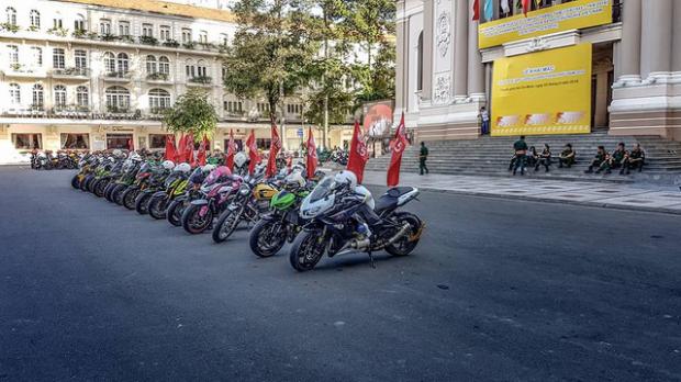 'Hộ tống' 100 đôi uyên ương trên xe đạp điện là đoàn mô tô phân khối lớn của câu lạc bộ Quận 5. Trong đó, 7h30 sáng, 100 đôi uyên ương tập trung tại Phố đi bộ Nguyễn Huệ để thực hiện lễ dâng hoa tại tượng đài Bác Hồ, còn đoàn mô tô 'khủng' xếp hàng dài trước nhà hát lớn. Ảnh: Facebook.