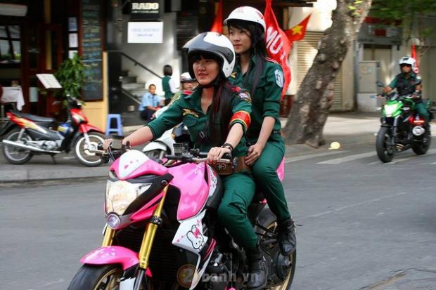 Mẫu xe Honda VFR 800 đảm nhận công tác dẫn đoàn mô tô đình đám. Phía sau là chiếc Kawasaki Z800 dán đề can Hello Kitty của nữ Biker Nguyễn Lâm Thanh Tú.