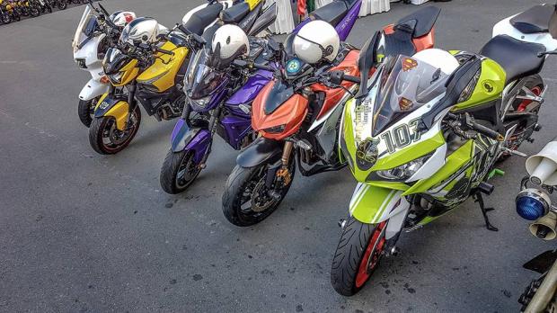 Cặp đôi Suzuki Bking vàng và tím khoe dáng cùng Kawasaki Z1000 màu cam và Honda CBR1000.