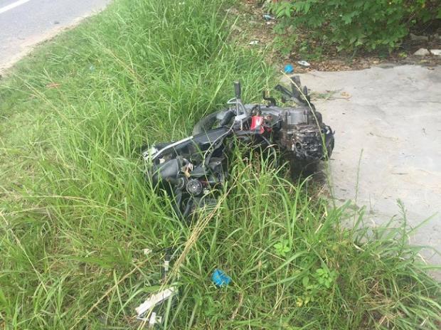 Cú va chạm mạnh đã khiến người đi xe máy văng xa hơn 20m và rơi sang lề đường đối diện, bị đứt lìa đầu và tử vong ngay tại chỗ. Chiếc xe văng vào vệ cỏ và biến dạng nặng nề, hư hại toàn bộ khung, vỡ bánh và vỡ toàn bộ động cơ.