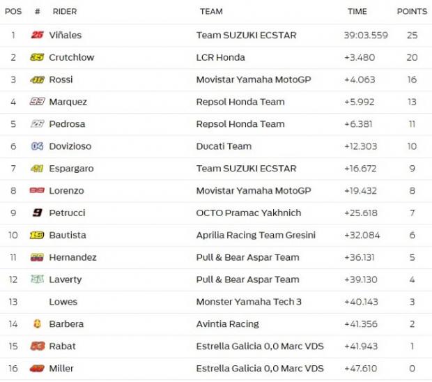 Kết quả chung cuộc Maverick Vinales giành chiến thắng đầy thuyết phục, Cal Cruthlow về thứ 2 và huyền thoại Valentino Rossi cán đích ở vị trí thứ 3, trong khi đó Marquez và người đồng độ Pedrosa lần lượt dàn vị trí thứ 4 và 5 chung cuộc. Có 4 tay đua phải bỏ cuộc bao gồm Ianone, Loris Baz, Stefan Bradl và Pol Espagaro.