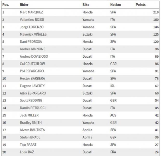 Trên bảng tổng sắp chung cuộc, Rossi đã vươn lên vị trí thứ 2 và chỉ còn cách Marquez 50 điểm trong khi Maverick Vinales dành thêm 25 điểm từ chiến thắng này và vượt lên Dani Pedrosa dành vị trí thứ 4 trên bảng tổng sắp.