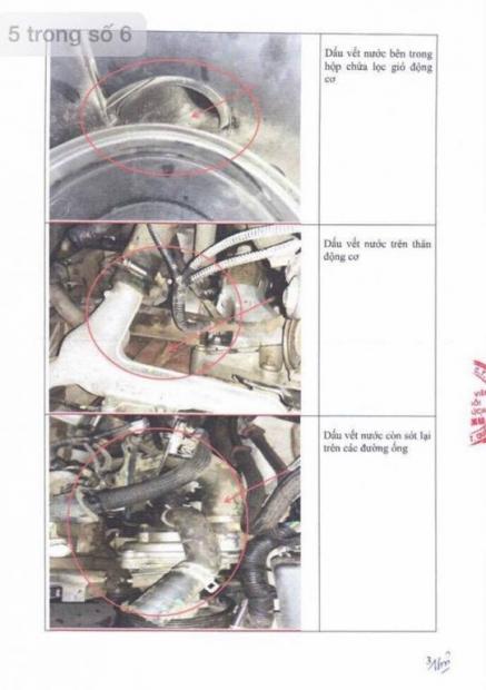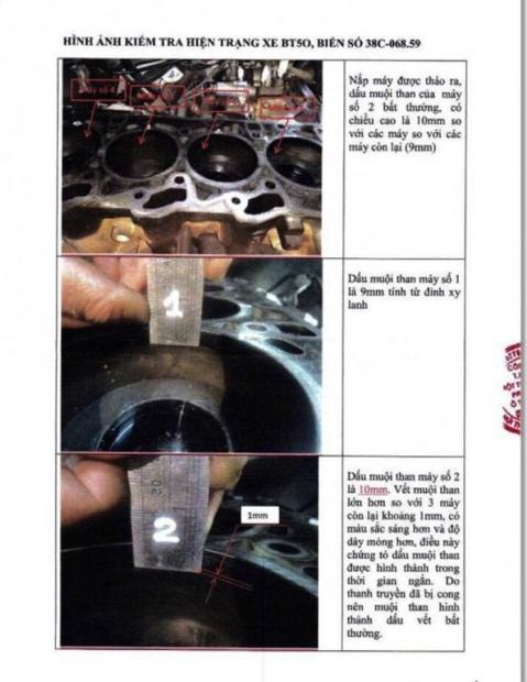 Được sự đồng ý của khách hàng, Mazda Quảng Trị đã tiến hành tháo nắp máy xe Mazda BT 50 để kiểm tra hiện trạng. Theo đó, nhân viên kỹ thuật ghi nhận tay biên máy số 2 bị gãy rời (rơi ra khỏi vị trí). Xuất hiện vết muội than trên máy số 2 có màu sáng hơn, mỏng hơn và chênh lệch 1mm so với các máy còn lại. Trên hộp chứa lọc gió và các chi tiết khác trên động cơ của xe có dấu vết nước từ môi trường bên ngoài xâm nhập vào.