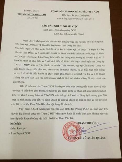 Báo cáo nội dung sự việc của Trạm CSGT Madaguoi.