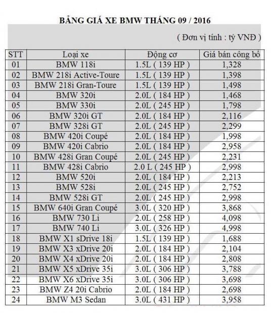 Bảng giá cập nhật của BMW