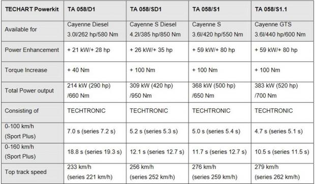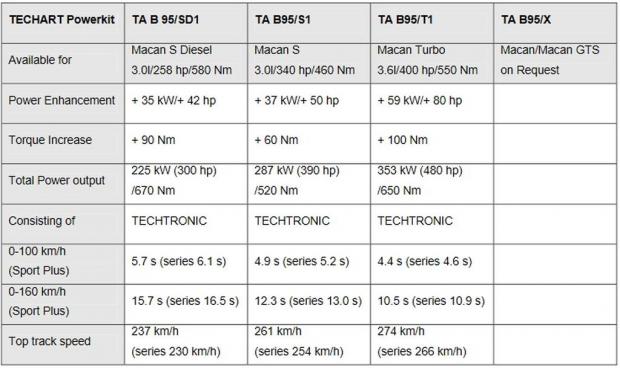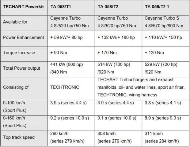 Bộ powerkit này được cung cấp cho toàn bộ dòng xe Macan và Cayenne SUV, nhưng với những ai đặc biệt quan tâm đến công suất động cơ được tăng lên nhờ TechArt, thì cụ thể Macan Turbo có sức mạnh 473 mã lực và mô men xoắn 650 Nm, còn Cayenne Turbo S có công suất 710 mã lực và mô men xoắn 920 Nm.