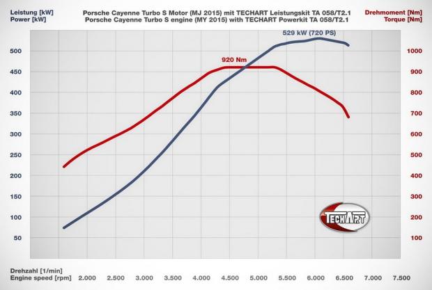 Đối với Cayenne Turbo S, ngoài trang bị quản lý động cơ Techtronic, hãng độ cũng bổ sung thêm cho xe loạt tăng áp mới, ống xả, ống dã dầu và nước cũng như bộ lọc khí, tất cả được phát triển dành riêng cho bộ powerkit có giá 24.500 euro này (~616 triệu VNĐ). Nhờ đó, Cayenne Turbo S có thể chạm ngưỡng 311 km/h, thay vì tốc độ tối đa ở phiên bản tiêu chuẩn là 284 km/h.