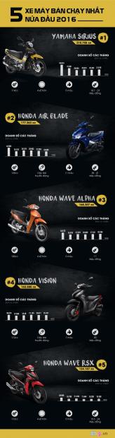 Trong top 5 xe số ăn khách nhất thị trường Việt Nam, các model của Honda vẫn chiếm số đông nhưng vị trí dẫn đầu là dòng Sirius của Yamaha với doanh số gần 240.000 xe.
