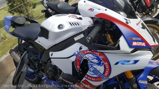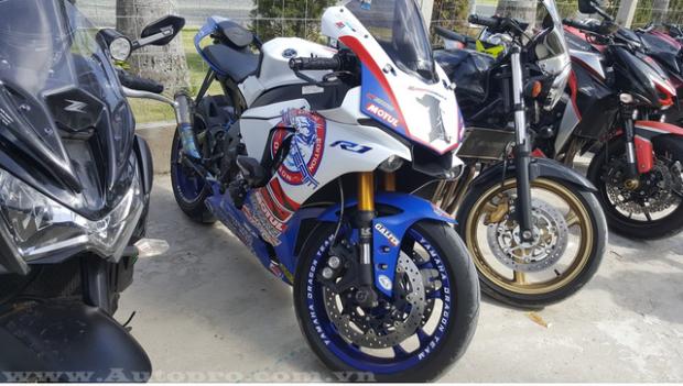 Có bộ áo nổi bật không kém siêu mô tô tiền tỷ Kawasaki Ninja H2 là chiếc sport bike đang khá được ưa chuộng tại thị trường Việt Nam, Yamaha YZF-R1. Mẫu xe phân khối lớn được chủ nhân cho lên bộ áo với hai tông màu chủ tạo là trắng-xanh đậm. Điểm nhấn là bộ tem màu đỏ và vành xe được sơn màu xanh bắt mắt.
