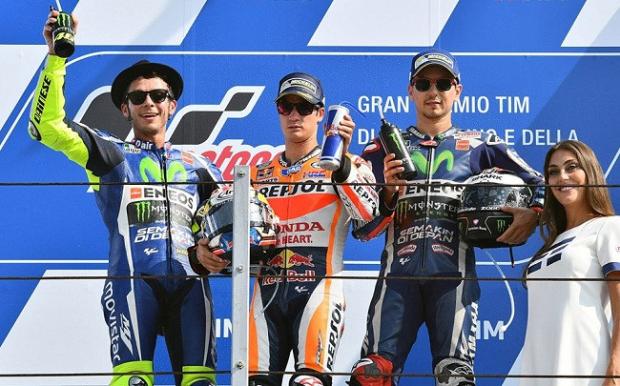 Thời điểm diễn ra cuộc đua ngày 11/9 ở trường đua Misano, thời tiết nắng ráo và nhiệt độ tương tự như ngày đua phân hạng, các tay đua đã bước vào cuộc đua dưới sự cổ vũ của hơn 100 nghìn khán giả cuồng nhiệt. Các tay đua hàng đầu đã tiếp tục đưa ra những tùy chọn lốp xe khác nhau cho riêng mình. Hai tay đua của Movistar Yamaha là Rossi, Lorenzo và Dovizioso (Ducati) đã chọn cặp lốp Medium-Medium, trong khi đó Vinales (Suzuki Ecstar) và Marquez (Repsol Honda) thì đua với lốp Hard-Medium. Còn Dani Pedrosa (Repsol Honda) và Michele Pirro (Ducati) sử dụng lốp Soft-Medium.