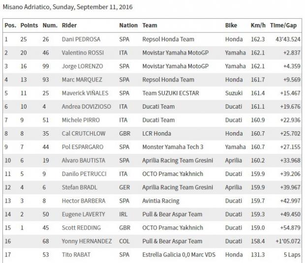 Trong khi tất cả mọi người đang chờ đợi cho chiến thắng của Rossi tại quê nhà thì bất ngờ Dani Pedrosa đã có một màn trở đầy ngoạn mục với việc chọn lốp và chiến thuật đua đầy bản lĩnh để dành chiến thắng chung cuộc.