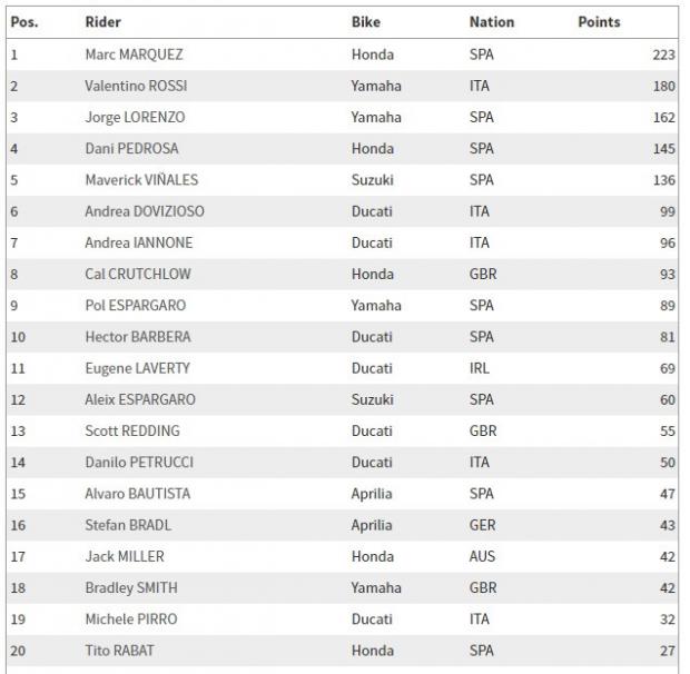 Các vị trí sau đó lần lượt thuộc về Lorenzo, Marquez, Vinales, Dovizioso… Vinales là tay đua bị phạt lùi 1 vị trí trong chặng đua này nhưng sau đó vẫn vượt qua Dovizioso để dành vị trí thứ 5 chung cuộc, trong khi đó chỉ có 3 tay đua bị loại. Tay đua Jack Miller không tham gia chặng đua này do chấn thương tay chưa hồi phục trong ngày phân hạng trước đó.