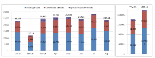 Nhờ kết quả trên, tổng lượng bán hàng của toàn thị trường tính đến hết tháng 8/2016 tăng 32% so với cùng kì năm ngoái. Trong đó, xe ô tô du lịch tăng 30%; xe thương mại tăng 33% và xe chuyên dụng tăng 46% so với cùng kỳ năm ngoái.