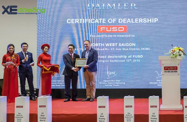 Các vị lãnh đạo làm nghi thức khai trương đại lý FUSO 3S Tây Bắc Sài GònTham gia buổi Lễ khai trương đại lý FUSO 3S Tây Bắc Sài Gòn, ông Michael Behrens, Tổng giám đốc Mercedes-Benz Việt Nam chia sẻ: “Đánh dấu sự chuyển mình mạnh mẽ của thương hiệu FUSO dưới sự tiếp quản Mercedes-Benz Việt Nam, chúng tôi không chỉ phát triển sản phẩm đa dạng, nâng cao chất lượng, mà còn phát triển hệ thống đại lý theo tiêu chuẩn toàn cầu, từ đó tạo dựng niềm tin và tiếp cận gần hơn với quý khách hàng trên cả nước.” Ông Michael Behrens, Tổng giám đốc Mercedes-Benz Việt Nam, trao giấy chứng nhận đại lý cho FUSO Tây Bắc Sài Gòn